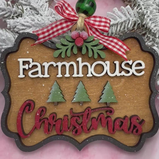 "Farmhouse" in white with "Christmas" in festive red lettering