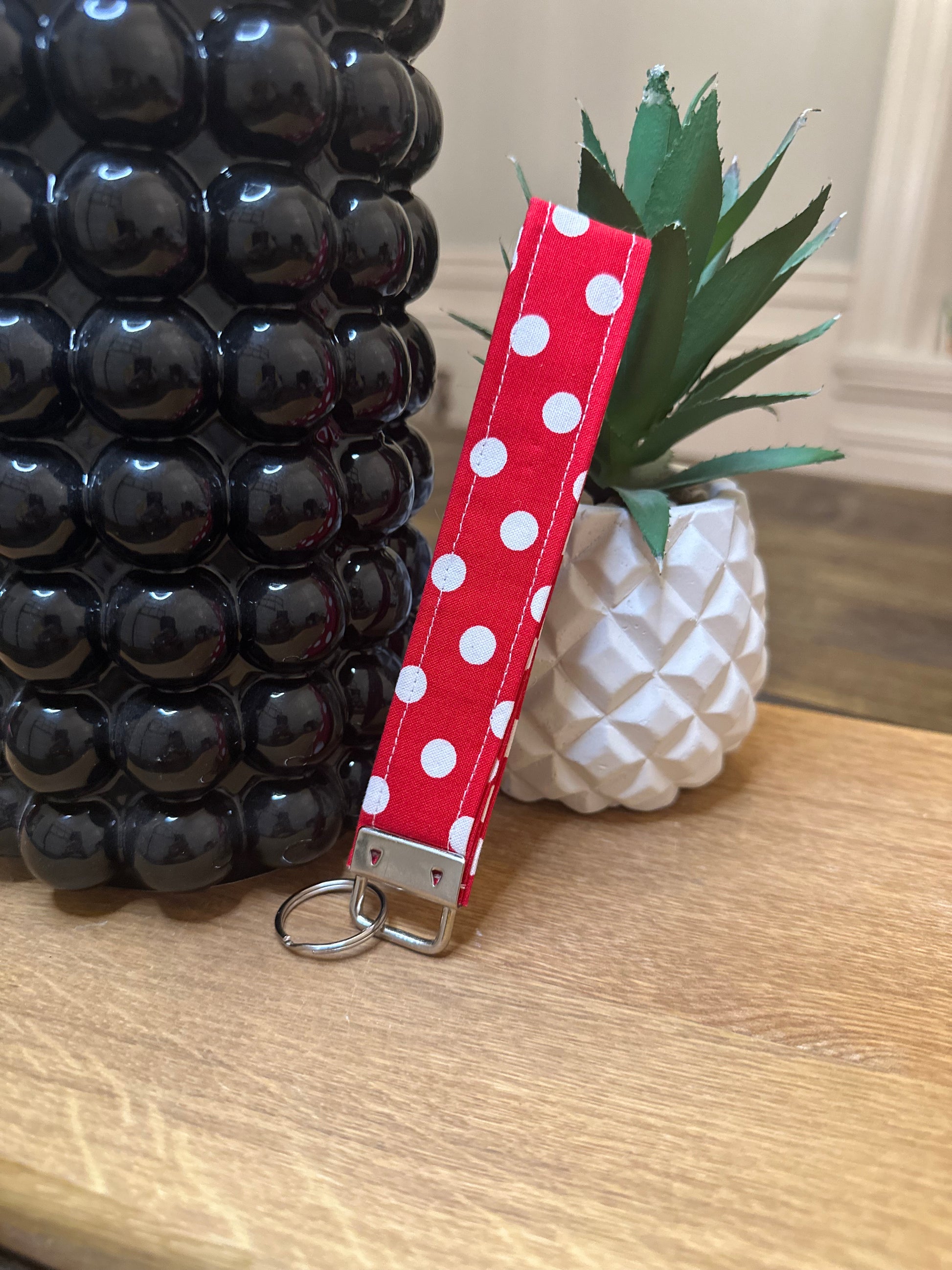 Add a pop of color to your daily routine with this charming handmade fabric keychain wristlet! Crafted from vibrant red fabric with playful white polka dots, this keychain wristlet is both stylish and practical. Perfect for keeping your keys easily accessible, whether you’re running errands or heading out for a walk.