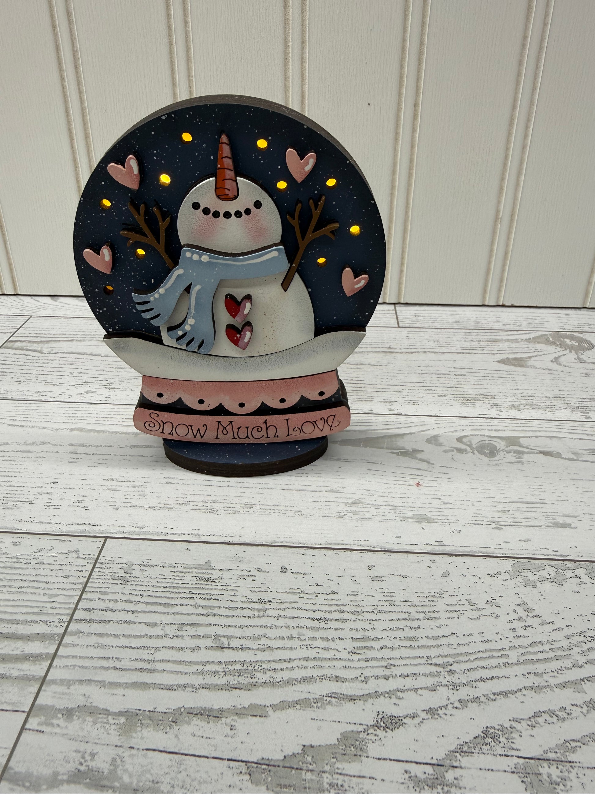 Add a cozy glow and a whole lot of charm to your winter decor with this Snowman Shelf Sitter. Featuring a smiling snowman surrounded by soft glowing lights and hand painted heart details, this piece brings warmth and whimsy to any space.